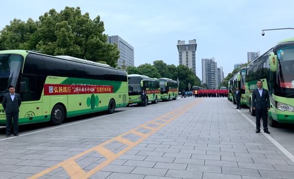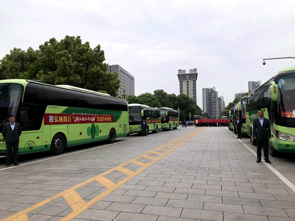 4月19日早上,在市政府南門廣場(chǎng),麗汽集團(tuán)旅游汽車分公司16輛綠色豪華大巴齊刷刷地排列著,16位駕駛員統(tǒng)一著裝,整齊劃一地站在車門迎候游客。這是2019年麗水市弘揚(yáng)踐行“浙西南革命精神”系列活動(dòng)啟動(dòng)儀式暨勞模、一線(優(yōu)秀)職工紅色療休養(yǎng)活動(dòng)發(fā)團(tuán)儀式的現(xiàn)場(chǎng)。綠色大巴與著紅色服裝的先進(jìn)相互映襯,形成了“紅+綠”融合發(fā)展的場(chǎng)景,和諧的畫面吸引了在場(chǎng)人員的關(guān)注,紛紛拿出手機(jī)拍場(chǎng)景,曬朋友圈。