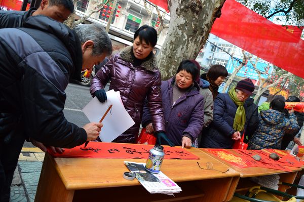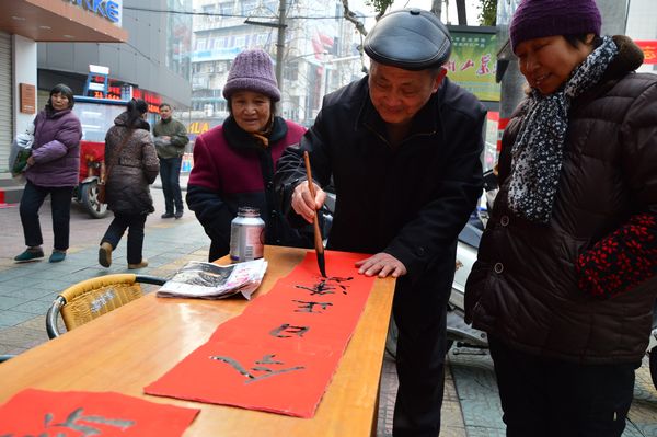 退休老黨員蘭延生、陳根松冒著嚴(yán)寒一大早來到了服務(wù)現(xiàn)場(chǎng),在現(xiàn)場(chǎng)為市民們義務(wù)寫對(duì)聯(lián)、送對(duì)聯(lián),蘭老的字清秀大方,陳老的字遒勁有力,在一旁觀看的市民“嘖嘖”稱道,他們自覺排起了長(zhǎng)隊(duì),耐心等待著兩老的“墨寶”,成為“黨員服務(wù)一條街上”的一大亮點(diǎn)。