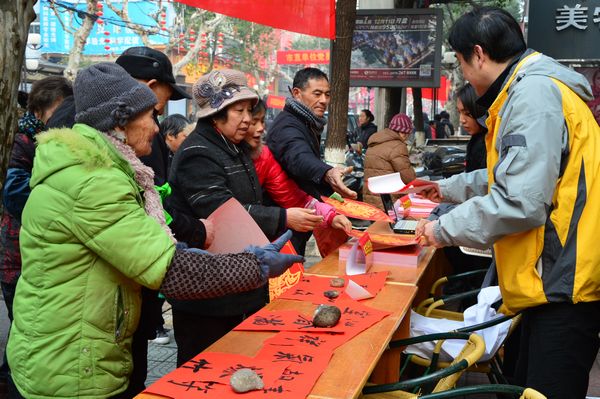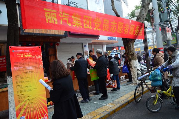 “貼上真正寫的春聯(lián),才有過年的味道”,一位排隊(duì)等候的姑娘對(duì)蘭老的字情有獨(dú)鐘。家住白云小區(qū)的齊大媽更是感慨自己已65歲,上還有90歲高齡母親,非要請(qǐng)?zhí)m老寫下:“今日正逢萱草壽,前身合是杏花仙”,橫披“九十大壽”對(duì)聯(lián),作為母親九十大壽的賀禮。拿到對(duì)聯(lián)后的齊大媽稱心滿意地說:“今天我非常高興、開心,你們這么冷的天為我們義務(wù)寫對(duì)聯(lián),抽出休息時(shí)間為人民服務(wù),祝福你們麗汽集團(tuán)生意越做越大?!?br/> 黨員們?cè)谥猩浇稚享斨L(fēng),冒著嚴(yán)寒,不斷為市民們送福字,寫對(duì)聯(lián),送對(duì)聯(lián),把暖暖的祝福送給市民。據(jù)統(tǒng)計(jì),集團(tuán)公司黨員服務(wù)一條街,送出“福”字1500余張,送出對(duì)聯(lián)200余副,發(fā)放班車時(shí)刻表、旅游信息表等1000余張。
