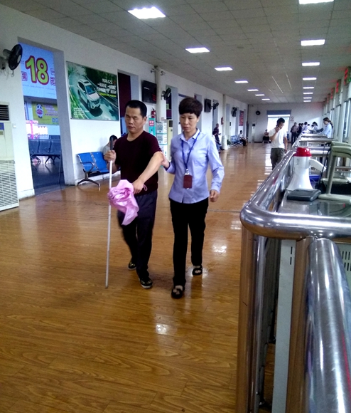 9:35到青田的車即將開始檢票,章莉走到盲人旅客跟前,準(zhǔn)備扶他提前檢票上車,這時盲人旅客不好意思的說:“我想去下廁所?!闭吕蛘f:“好的,我扶你去?!闭吕蛞恢狈鲋と寺每偷侥袔T口,因不方便進(jìn)到男廁里面,章莉就叫住了一位男旅客,叫他幫忙把盲人旅客扶進(jìn)去上廁所,自己則在男廁門口等待。好心的男旅客很爽快地答應(yīng)了,嘴里還一直夸章莉的服務(wù)好、東站的服務(wù)好。