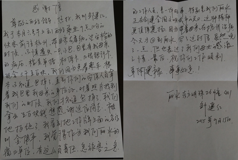 盡快送回“救命錢”,對金偉平來說,是做好本職工作,但對鄒女士母女來說,卻也猶如雪中送炭,正如鄒女士在信中寫道,“作為我們麗水的窗口單位(客運西站),有這樣負(fù)責(zé)任,急旅客之急的工作人員,是一件好事,特別是我們麗水正在創(chuàng)建全國文明城市的關(guān)口,這種精神更值得表揚?!?/p>