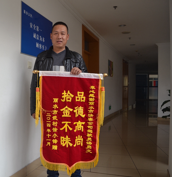 “拾金不昧,本不是新聞了,但輪到自己親身體驗(yàn)這種社會(huì)正能量的日益增長(zhǎng),還是讓我倍感欣喜?!?0月16日傍晚,在江蘇開超市的徐先生手拿錦旗,來到快客分公司車隊(duì),對(duì)駕駛員湯勇文拾金不昧的精神予以表?yè)P(yáng)。他說,11月14日他乘坐18:45從杭州回麗水的班車,一時(shí)大意把隨身的錢包遺失了,里面有五千多元的現(xiàn)金和若干張銀行卡。次日,當(dāng)他焦急萬分來到快客車隊(duì)時(shí),卻發(fā)現(xiàn)駕駛員湯勇文正拿著妥善保管的皮夾等著他?!?br/> 據(jù)了解,當(dāng)天晚上11時(shí)左右,駕駛員湯勇文在做下客后的檢查時(shí),發(fā)現(xiàn)一只皮夾被旅客遺落在車廂通道上,他打開皮夾一看,足有好幾千元的現(xiàn)金和各類卡,他心想,這么重要的東西旅客一定會(huì)再回來找的,他把情況向值班隊(duì)長(zhǎng)報(bào)告后,又在下客區(qū)足足等了十余分鐘,也不見旅客回來找。于是,他將皮夾保管完好等著歸還旅客,也就有了開頭一幕。